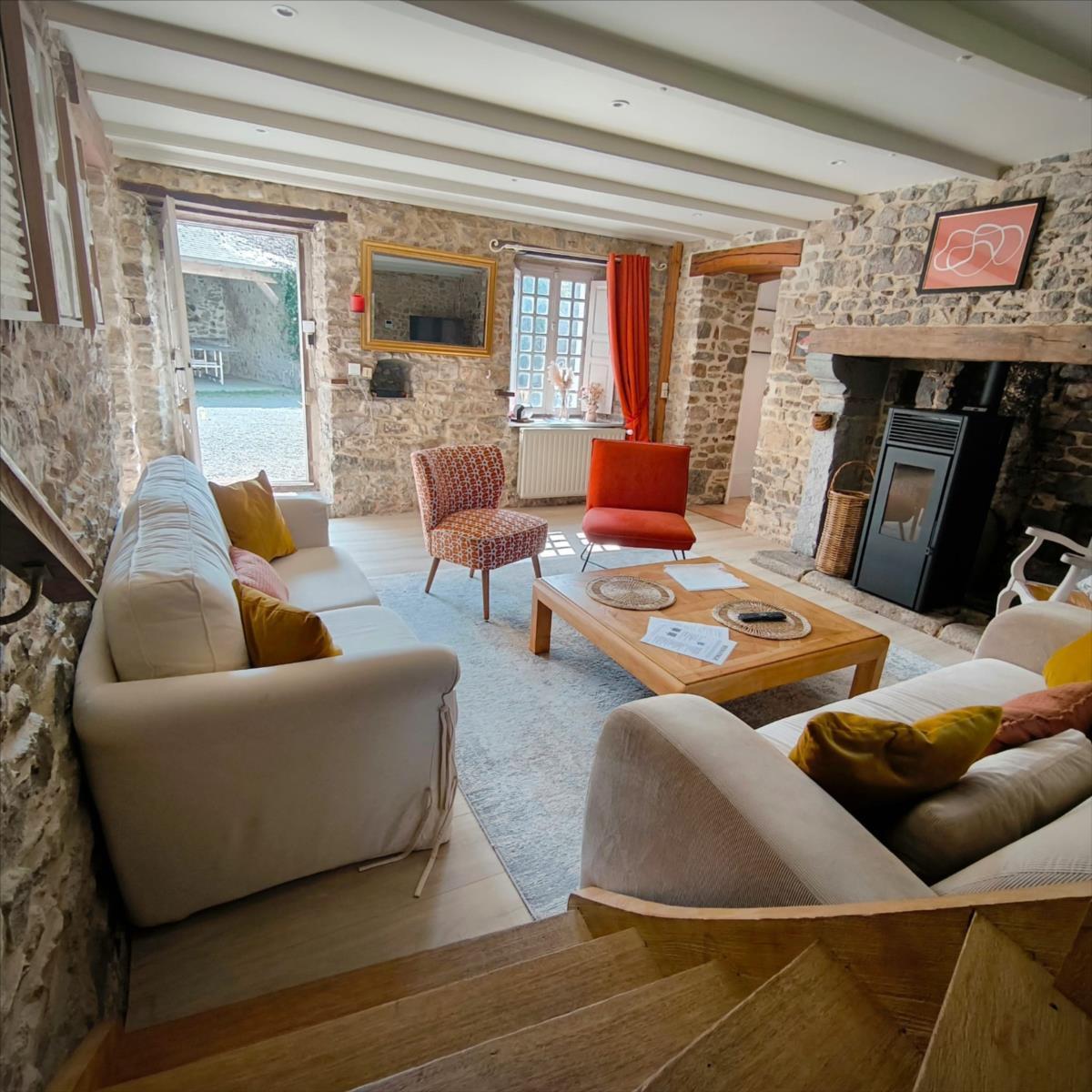 Cette charmante maison en pierre d'environ 156.9 m² vous offre un cadre de vie agréable. Dès l'entrée, vous serez accueilli dans un salon cosy, agrémenté d'un poêle à granulés pour des moments de détente chaleureux. La cuisine aménagée et équipée, ouverte sur la salle à manger, invite à la convivialité. Vous trouverez également une pièce aménagée en salle de jeu ainsi qu'un espace buanderie/toilettes.