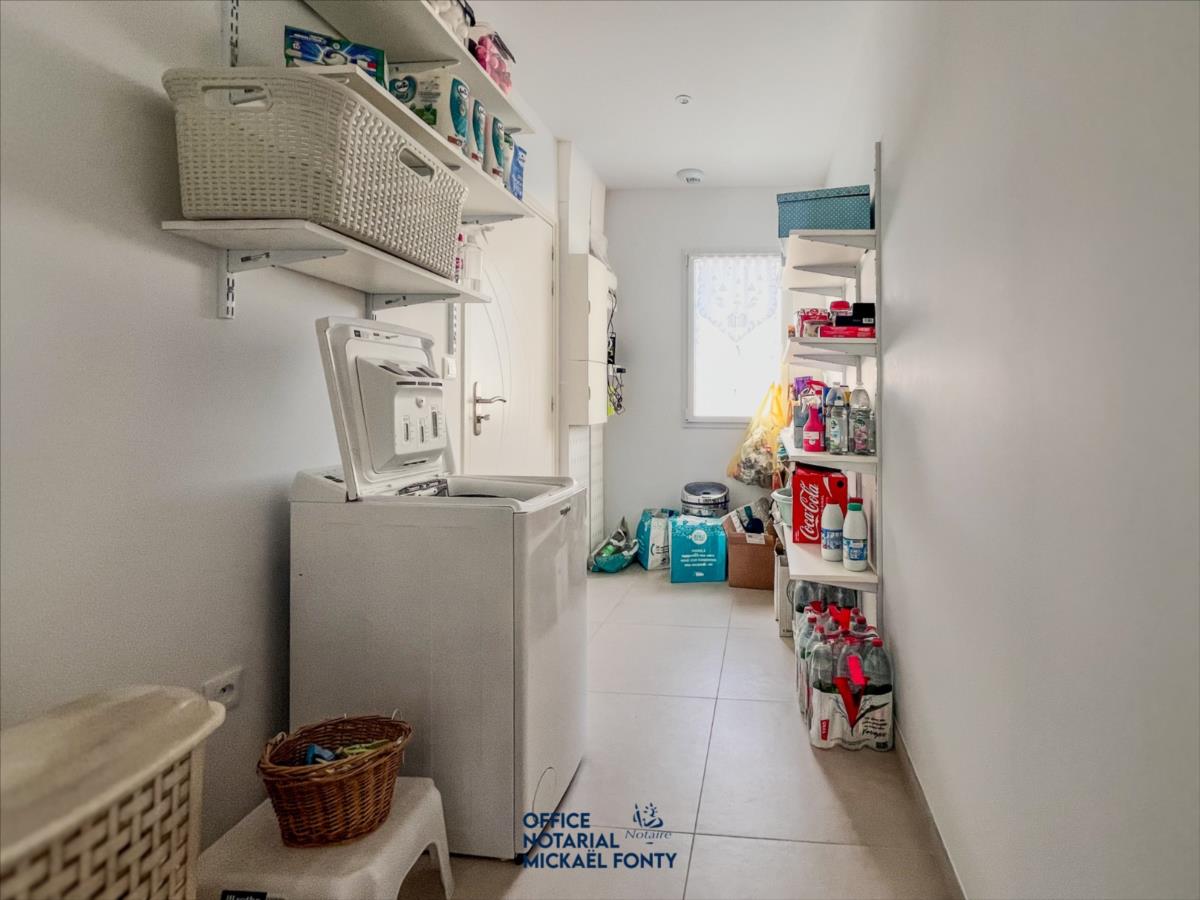 Cette élégante maison d'habitation (2022 - conforme à la réglementation thermique RT 2020) d'une surface d'environ 191 m2 se compose, au rez-de-chaussée, d'une entrée agrémentée de placards, ouvrant une vaste pièce à vivre comprenant une salle pièce à vivre comprenant une salle à manger, un espace salon et une cuisine aménagée et entièrement équipée. Dans le prolongement, un espace nuit dessert deux chambres dotées de rangements, ainsi qu'une salle d'eau avec wc. Un cellier, attenant au garage carrelé, complète ce niveau.